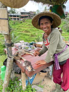 Our final adventure together in Ubud was to walk through the rice fields to Sweet Orange a local ‘hot spot’ which endeavors to maintain the original integrity of Ubud, among the rice fields. Yum and fun, plus a tiny visitor who started out on Claudio’s leg then tried to get a lift in his manbag.